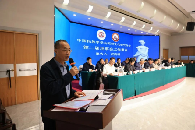 中国民族学学会理事、中国民族学学会昭君文化研究分会第二届理事会副会长、呼和浩特市昭君文化研究会会长、二级研究馆员武高明,代表第二届理事会向大会做了工作报告,全面总结了过去七年来分会在学术研究、文化交流、组织建设与社会服务等方面取得的成效。