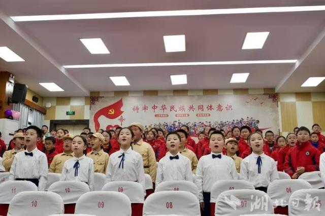 文艺展演环节精彩纷呈,成为文化交流的生动载体。兴山学子们以诗朗诵《冰雪长津湖》缅怀革命先烈,激昂的语调传递着红色基因的薪火相传;民族歌曲《火塘边》婉转悠扬,展现了荆楚大地的民族风情与人文温情。玉泉区同学们则以诗朗诵《在天晴了的时候》勾勒出雨过天晴的清新意境,用豪迈洒脱的传统蒙古舞演绎草原儿女的热情奔放,舞姿间流淌的民族神韵让云端观众深深沉醉。最后,两校学子同声唱响《爱我中华》,稚嫩而真挚的歌声汇聚成民族团结的最强音,将活动气氛推向高潮。